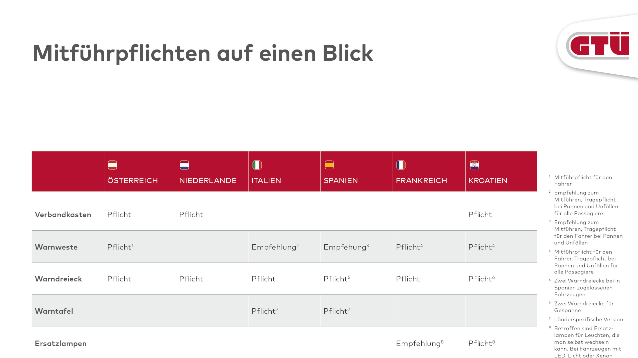 Die GTÜ rät, sich vor der Fahrt in die Ferien über die Mitführpflichten im Ausland zu informieren